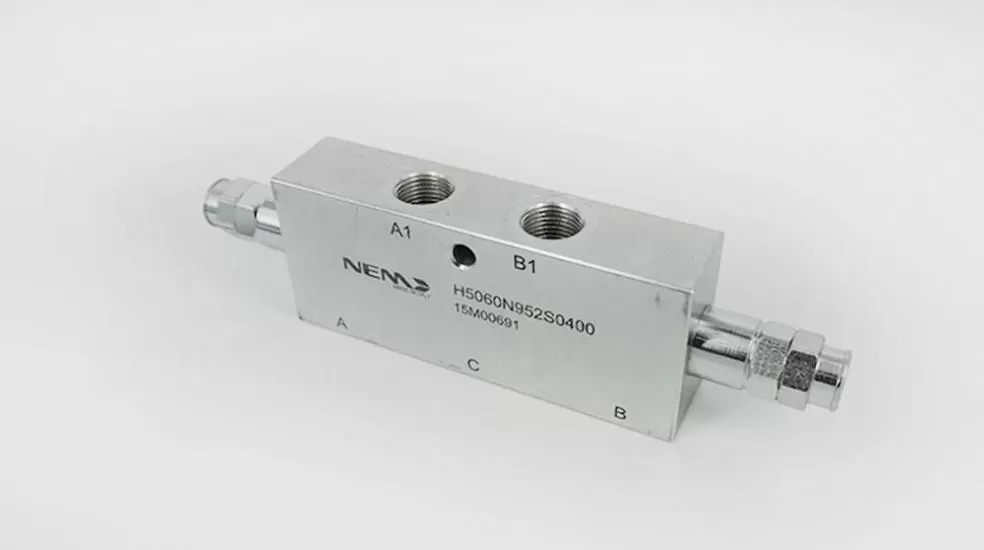 H3061N403S0300 двухсторонний тормозной (уравновешивающий) клапан производства NEM (Италия). Предназначен для удержания и контроля опускания груза на соответствующем рабочем органе (гидроцилиндре). Не компенсирован по давлению, не может использоваться совместно с гидрораспределителем, у которого рабочие органы изолированы в нейтральном положении (в отличие от компенсированных). Обязательно требуется использовать гидрораспределитель с рабочими отводами, соединёнными со сливом в нейтральном положении. Пружины клапана необходимо настроить на давление, превышающее на 30% максимально возможное давление в рабочем контуре. Клапан оснащён портом 1/4" для подключения манометра. Фланцевый монтаж на гидроцилиндр.